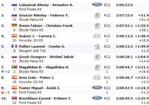 Gran 2° posto per Nikolay Gryazin in coppia con Fedorov, vincitore di due prove speciali; gara di assoluto valore per il ragazzo che si scopre veloce e competitivo anche su asfalto. Gryazin tra l’altro è anche il vincitore dello Junior ERC Under 28, ovvero il campionato riservato ai giovani al volante delle vetture R5. Alle spalle del russo ha concluso su un’altra Skoda Fabia il tedesco Fabien Kreim, navigato da Christian; Kreim, dopo qualche difficoltà nelle Azzorre, è risultato finalmente veloce ed è migliorato costantemente strappando il podio allo spagnolo José Antonio Suarez, quest’ultimo in gara su una Hyundai i20 del team Hyundai Motor España. Anche per Suarez questa è stata una buona prova, considerando che era quasi al debutto sulla i20 R5. In crescita il francese Laurent Pellier, 5° con la Peugeot 208 R5 del team Peugeot Academy che precede la Skoda del competitivo Grzyb. 7° posto strappato con le unghie e con i denti per Bruno Magalhaes, autore di una prova così così ma condita anche di qualche problema accusato dalla Fabia preparata dal team ARC Sport che non gli ha consentito di esprimersi al meglio. Il portoghese ha beffato sull’ultima prova lunga gli spagnoli Ares e Fuster, rispettivamente alla guida di vetture Hyundai e Ford. A chiudere la top10 è il norvegese Brynildsen, non abituato a correre su asfalto e che sicuramente si rifarà nei prossimi appuntamenti su terra.