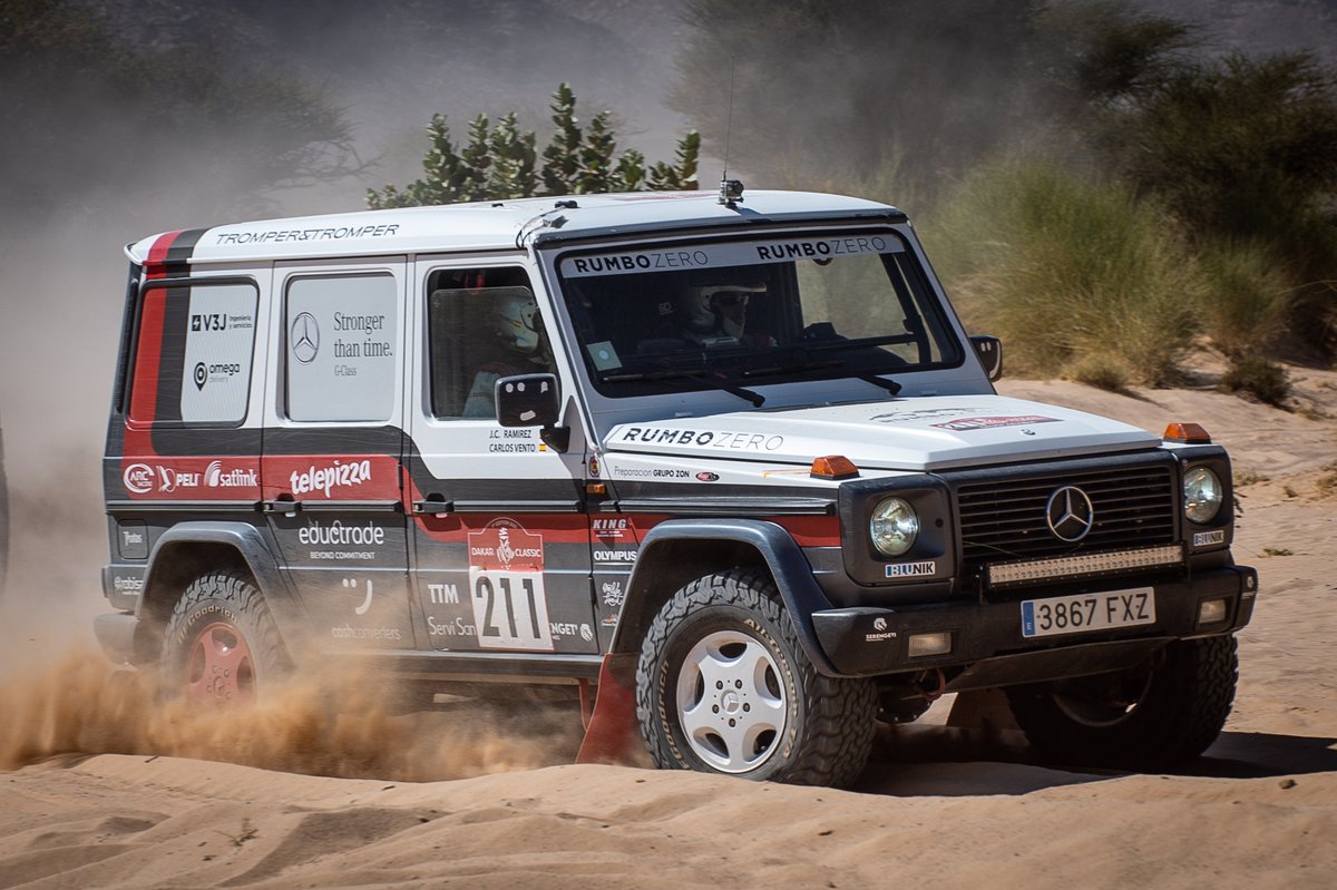 Fin qui la Classic ha disputato 6 tappe proprio come la Dakar normale. Unica eccezione la tappa 2, cancellata per impraticabilità. I più costanti sono stati Jesus Fuster Pliego e Ramirez Moure che comandano la classifica con il Mercedes Classe G-320 preparato dal team Rumbo Zero. Il 4×4 della casa di Stoccarda è datato 1994 ed è stato fornito di un nuovo motore turbodiesel, come nuovo è anche il cambio a 5 rapporti. La vettura sta avendo un discreto successo nel Classic tanto che anche l’altro pilota del team, Antonio Gutierrez, si classifica al 5° posto. Tuttavia il Classe G preparato dagli spagnoli che si trova in testa è seguito ad un solo 1 punto dal Toyota Land Cruiser HDJ80 dei francesi Mogno-Druhlon. Gara apertissima! La coppia Euvrard segue più staccata, ma non troppo, su un “moderno” Mercedes Classe M con una bellissima livrea blu Gauloises. Al 4° posto ancora un altro Toyota Land Cruiser HDJ80 ex Jacky Hickx dell’equipaggio spagnolo Iglesias-Posada. Un dominio tutto Mercedes-Toyota tanto che al 6° posto c’è un altro mezzo della casa di Stoccarda, ma questa volta si tratta del camion guidato da Obiols che sta beneficiando del grande esperto navigatore di regolarità Xavi Ribas.